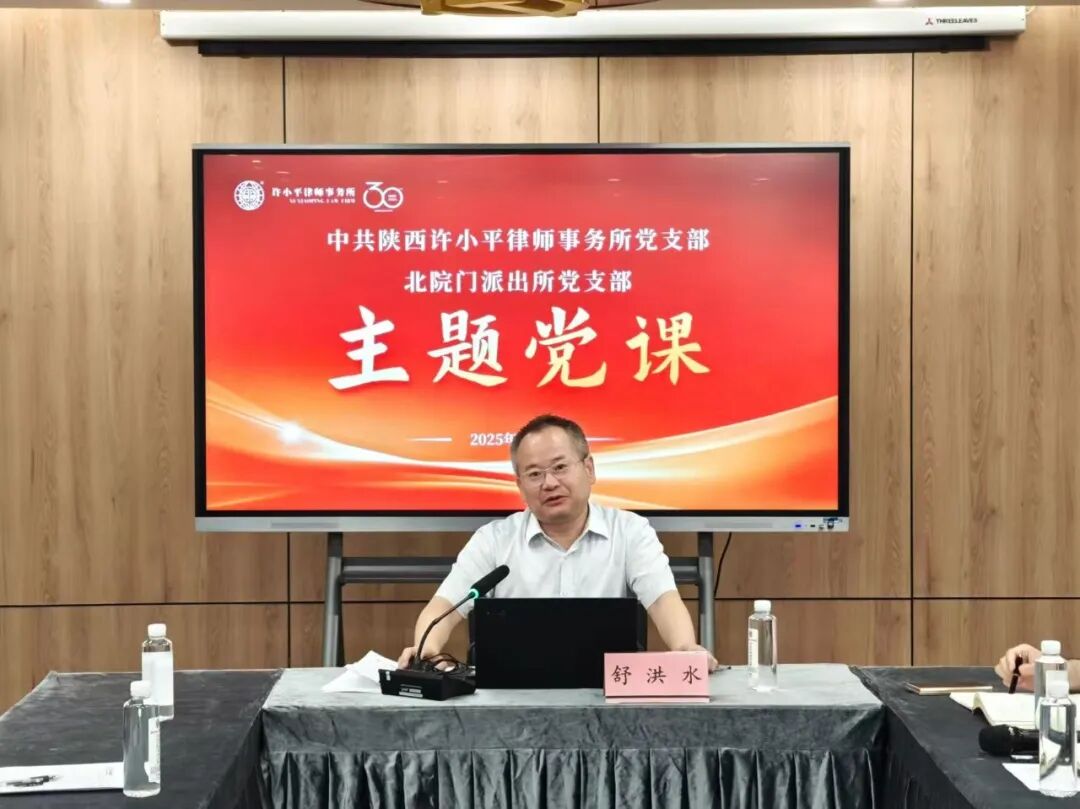 党课特邀西北政法大学国家安全学院(反恐怖主义法学院)院长舒洪水教授担任主讲人。陕西许小平律师事务所党支部书记路航、副书记张举会率全体党员律师,与北院门派出所教导员周延带领的全体党员民警齐聚一堂,在思想淬炼中共同纪念党的生日。