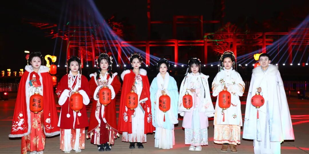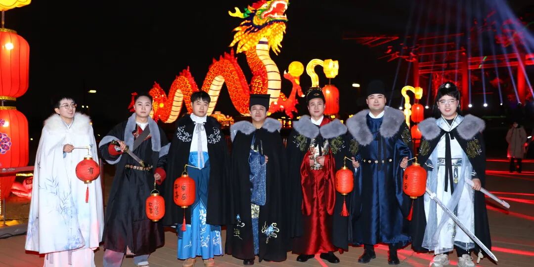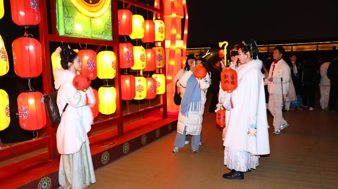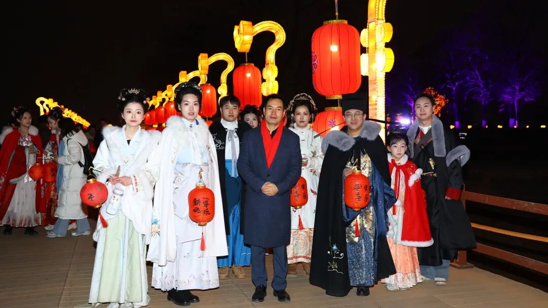 在灯会游览环节,大家三五成群漫步于灯火辉煌的大明宫中,古朴的建筑轮廓与现代灯光艺术交相辉映,处处洋溢着节日的喜庆与文化的厚重。