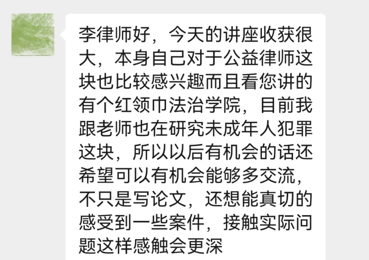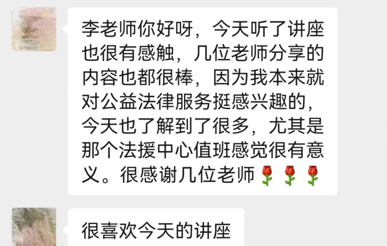三位律师的分享,以其鲜活的案例与真挚的感悟,深深触动了在场的每一位学子。大家在感慨之余,更坚定了未来的方向,纷纷立志要投身公益法律事业,将这份社会责任与初心使命薪火相传。讲座结束后,许多同学自发地通过线上渠道发来反馈,言语恳切,令人动容。