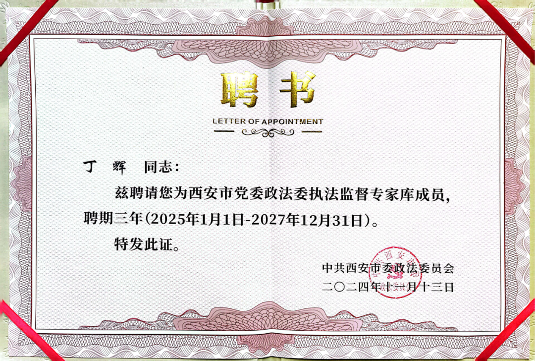 此次丁辉律师受聘为执法监督员,不仅是对其个人专业能力的肯定,也是我所的一项殊荣。丁辉律师表示,将以此次聘任为新的起点,在执法监督岗位上发光发热,为平安西安、法治西安建设贡献力量,在推进中国式现代化西安实践中展现新时代律师的担当与风采。