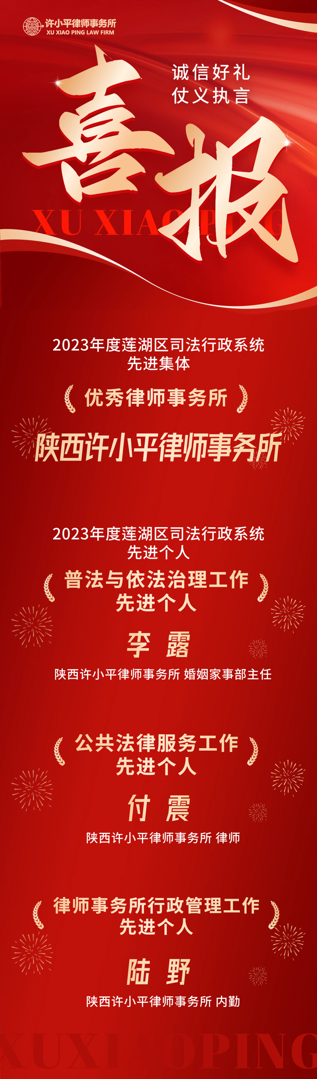本次通报表扬中,陕西许小平律师事务所荣获莲湖区2023年度司法行政系统“优秀律师事务所”,我所婚姻家事部主任李露律师荣获普法与依法治理工作先进个人,付震律师荣获公共法律服务工作先进个人,陆野同志荣获律师事务所行政管理工作先进个人。