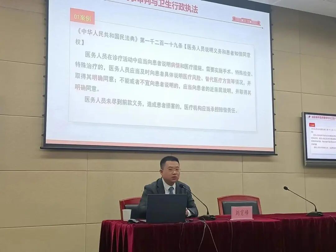 此次培训刘霄峰律师以《宪法、法律中关于医疗卫生法律体系构建》为主题,围绕医疗机构依法执业与卫生行政执法方面展开。