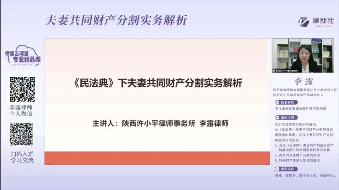 2023年11月30日下午,陕西许小平律师事务所高级合伙人李露律师受邀做客律新V品直播间,开展以“夫妻共同财产分割实务解析”为题的普法专题讲座。本次讲座通过线上直播间的形式与大家见面,共计千余人在线参与讲座。