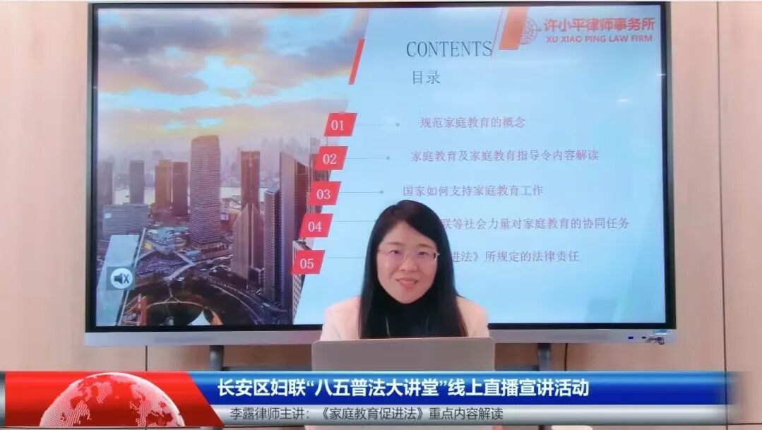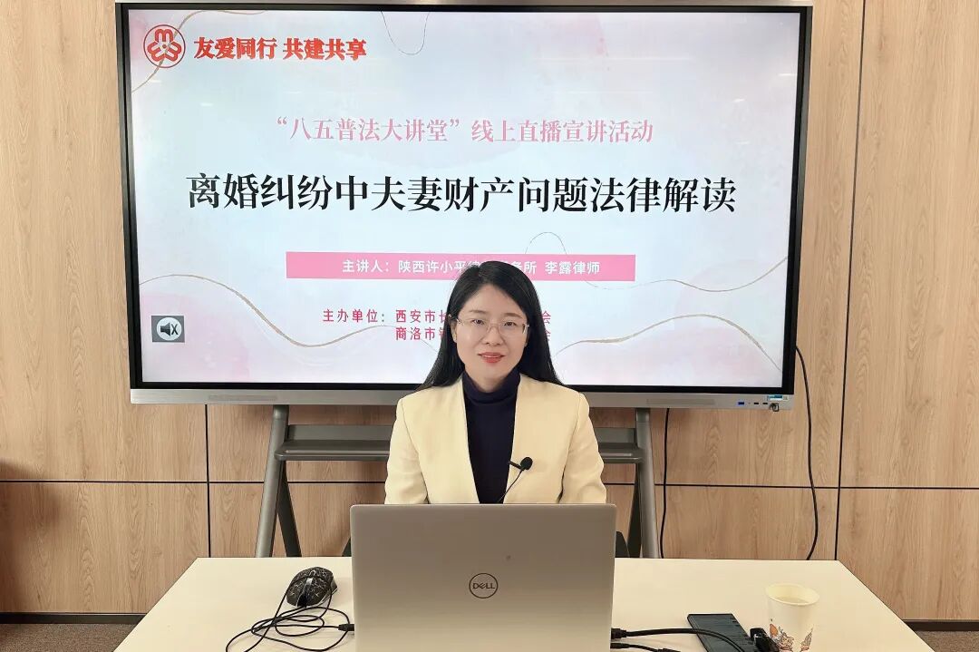 为进一步深入贯彻学习党的二十大精神、学习中国妇女第十三次代表大会精神,提升广大群众的法律意识。2023年11月16日-17日,由西安市长安区妇联、商洛市镇安县妇联联合主办的“八五普法大讲堂”宣讲活动顺利开展。本次活动以线上直播的形式进行,特别邀请陕西省妇联系统“八五”普法讲师团成员、陕西许小平律师事务所高级合伙人李露律师开展以“《家庭教育促进法》重点内容解读”,“离婚纠纷中夫妻财产问题法律解读”为主题的系列讲座。直播间共计两千余人同时在线观看学习。