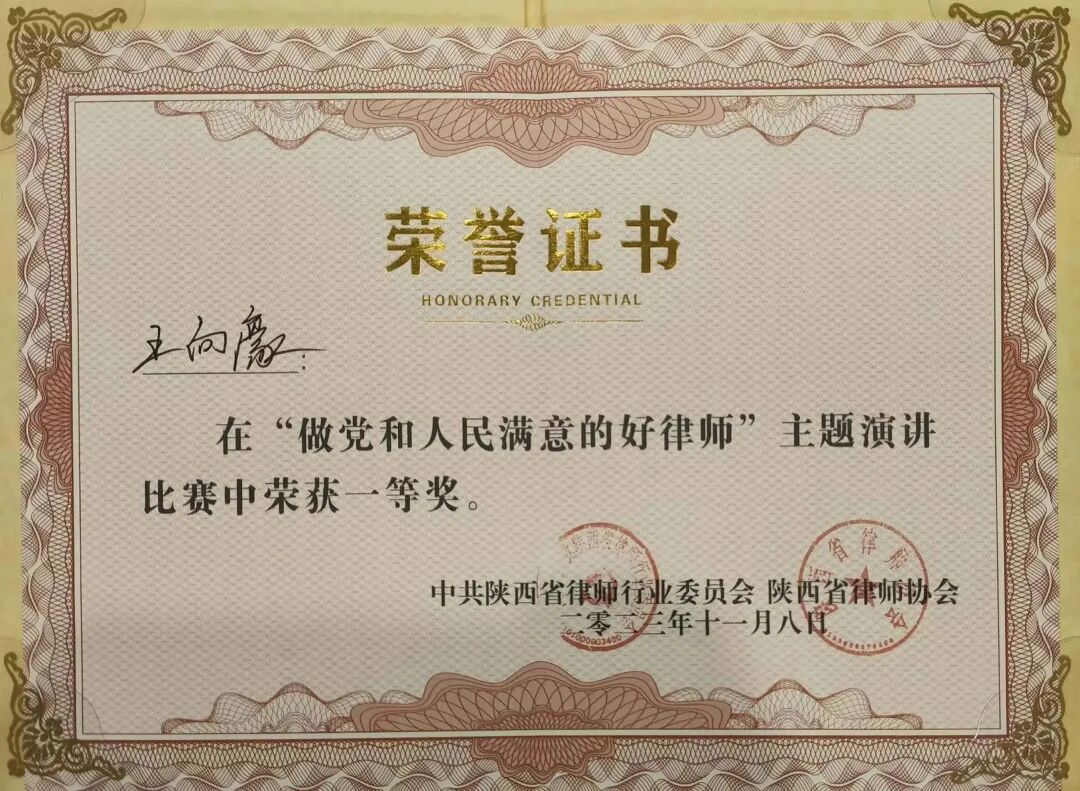 2023年11月8日,陕西省律师行业党委、陕西省律师协会联合举办“做党和人民满意的好律师”主题演讲比赛圆满闭幕。经过与全省十三个地市、近百名选手,从初赛到复赛激烈角逐。我所王向豪力压群雄、以95.42分脱颖而出,最终荣获本次演讲比赛一等奖。