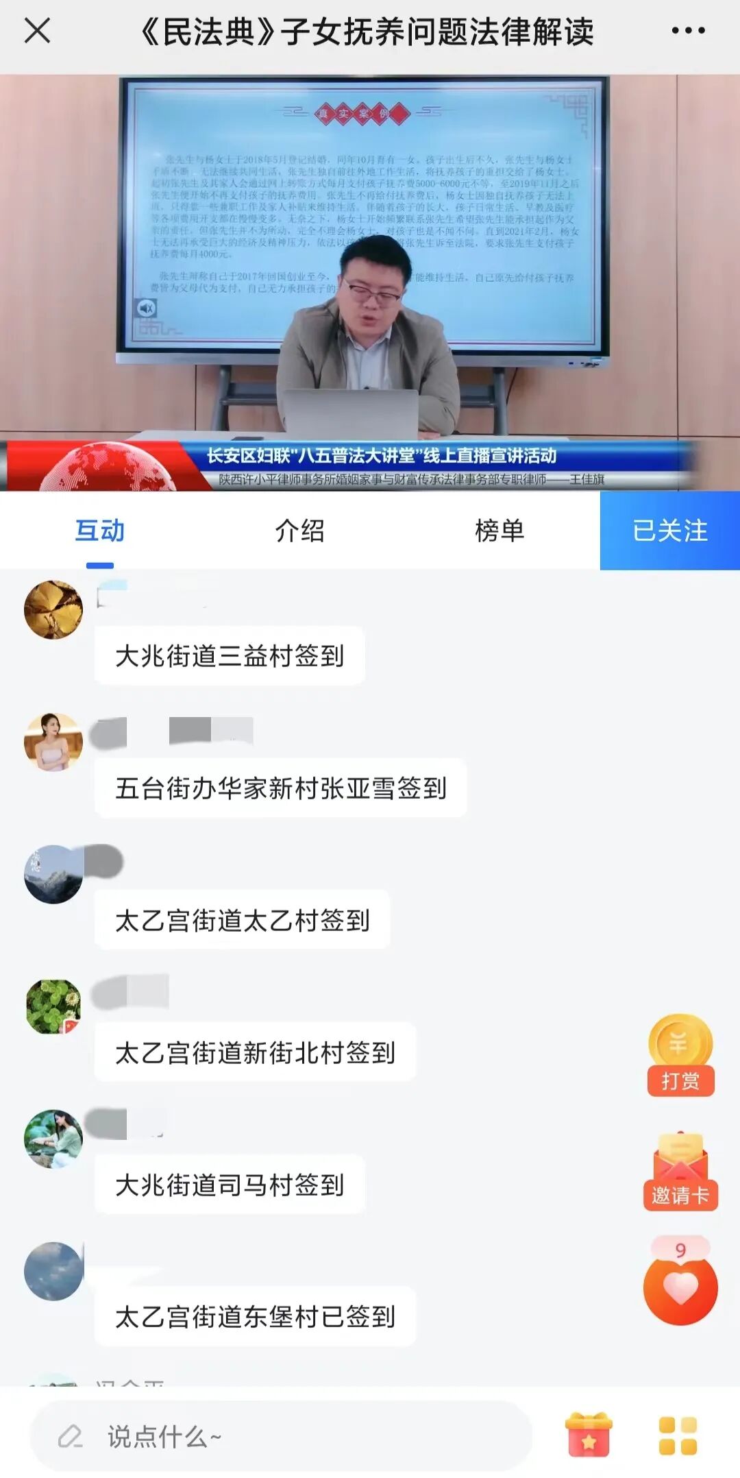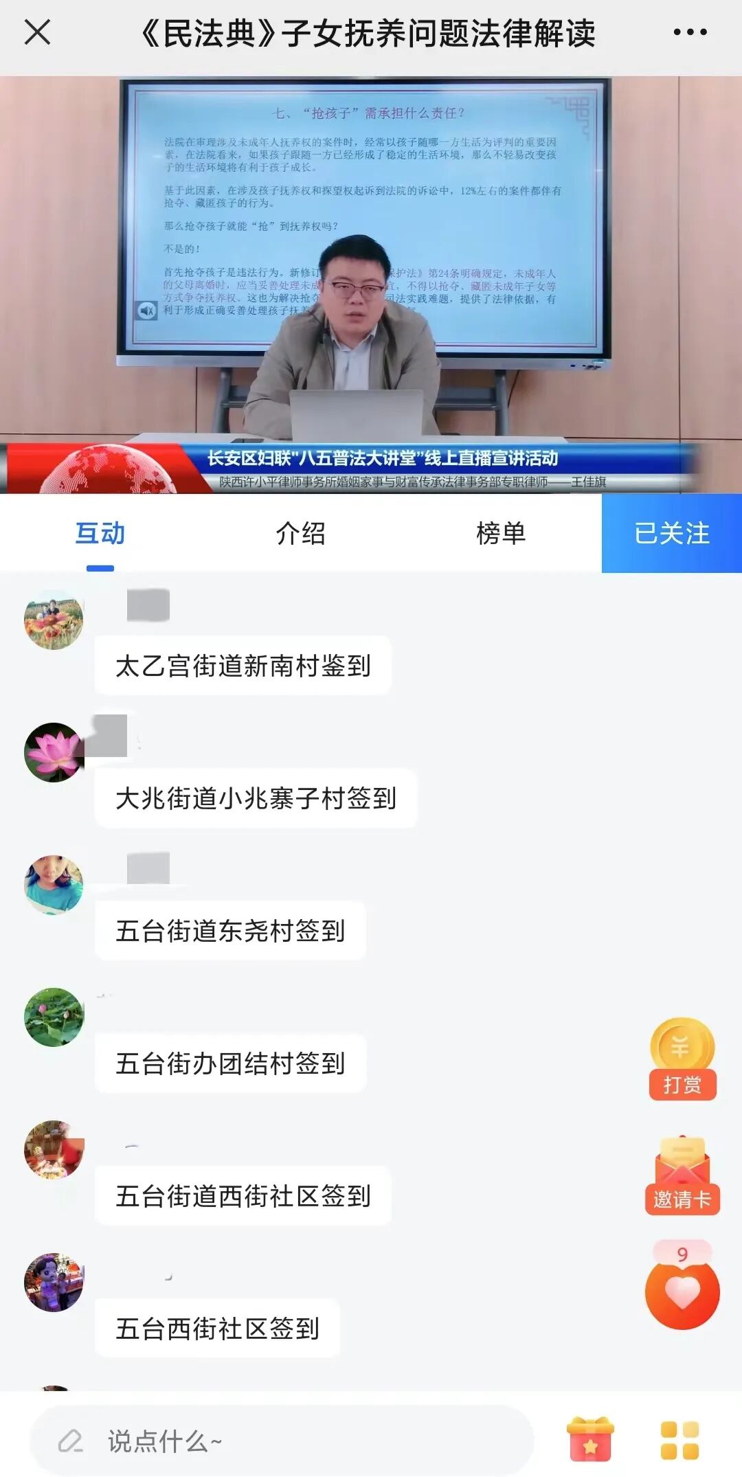 讲座中,王佳旗律师通过通俗易懂的语言,对《民法典》中涉及到子女抚养问题的具体法律规定进行了重点分享。特别对“婚内能否主张抚养费”,“抚养费的认定标准”,“抢孩子应承担的责任”等大众关注的热点问题进行了详细的讲解,让大家对涉及到子女抚养的问题有了全新的认识和理解。王佳旗律师结合法律规定,援引自己经办的现实案例,融合情理与法理,为维权干部在解决涉及子女抚养问题时提供了新思路和新方法,也让大家对婚姻家庭中子女抚养问题的矛盾化解有了更加清晰、直观的认识。本次讲座受到了直播间观众的广泛好评,各街道、社区的妇联干部及广大网友纷纷在评论区签到留言。