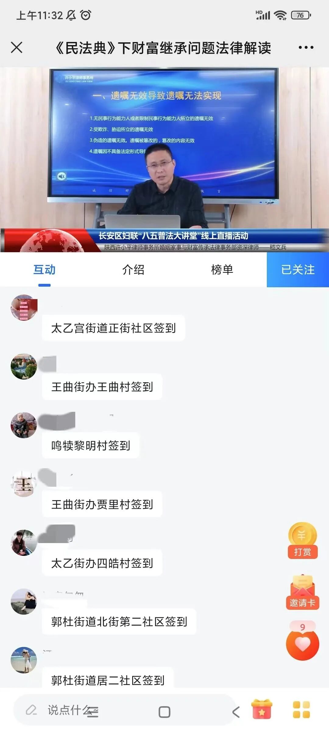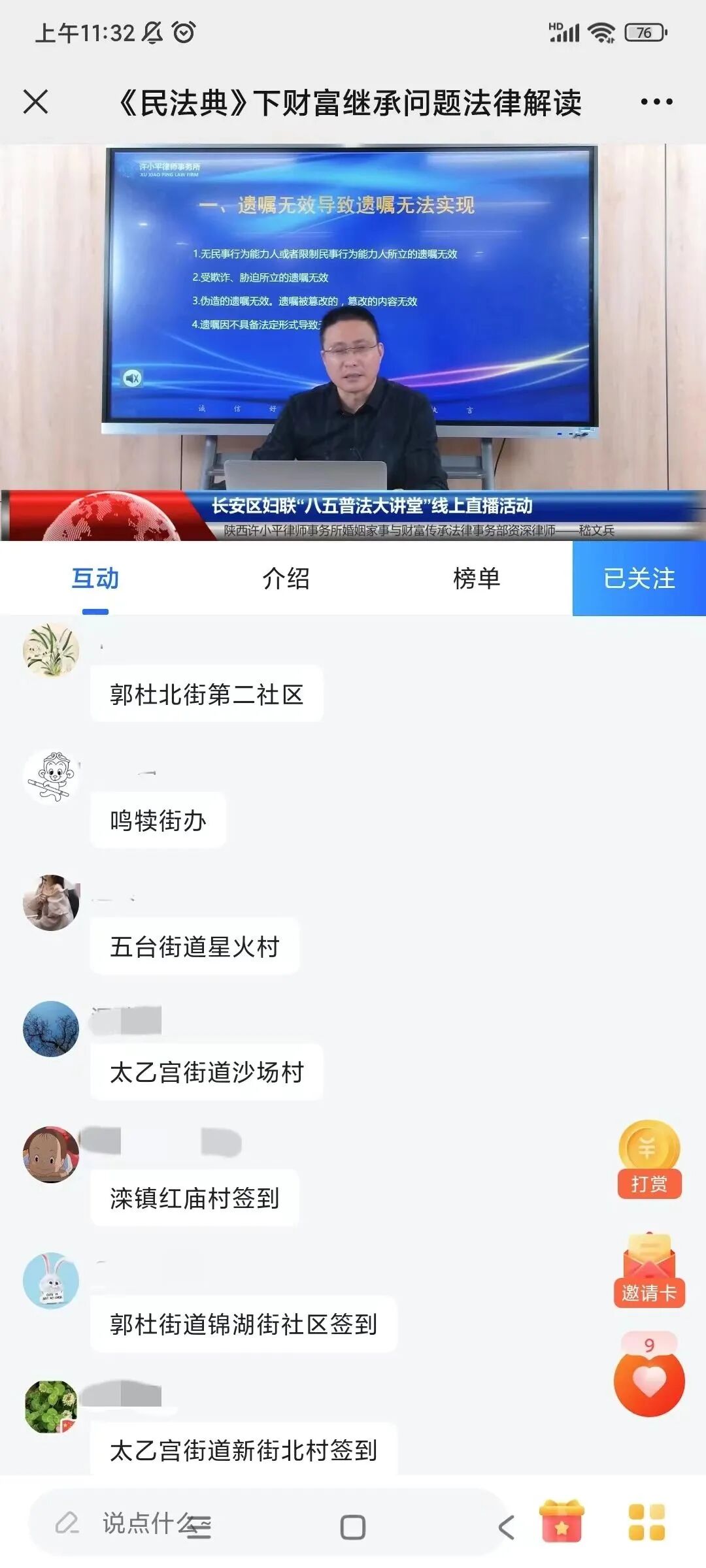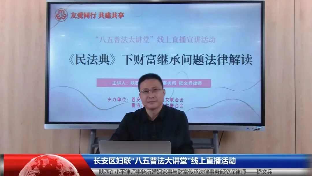 为深入贯彻落实党的二十大会议精神,增强基层妇联干部及人民群众的法律意识。由西安市长安区妇联、商洛市镇安县妇联联合主办的“八五普法大讲堂”线上直播宣讲活动顺利开展。本期普法宣讲活动特别邀请西安市妇联优秀维权志愿者、陕西许小平律师事务所婚姻家事与财富传承法律事务部资深律师嵇文兵开展以“《民法典》下财富继承问题法律解读”为主题的普法专题讲座。直播间共计百余人在线观看学习。