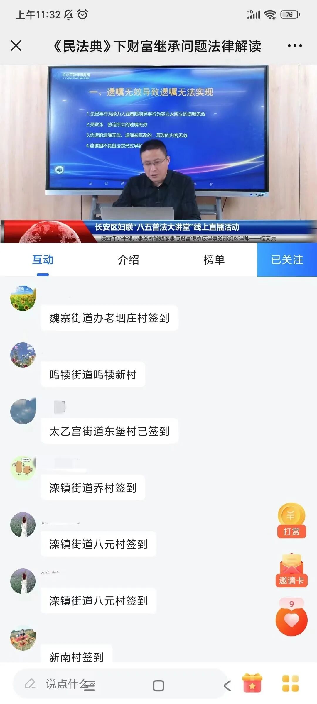 讲座中,嵇文兵律师通过通俗易懂的语言,对《民法典》中涉及到财富继承问题的修改亮点进行了重点讲解,特别对遗嘱的种类和分类、遗嘱无效的情形、遗赠扶养协议与遗嘱的区别等热点问题进行了详细地解读。让大家对涉及到继承的问题有了全新的认识和掌握。嵇文兵律师通过以案说法、以案释法的形式,帮助广大群众树立办事依法、遇事找法、解决问题用法、化解矛盾靠法的法治理念。本次讲座受到了直播间观众的广泛好评,各街道、社区的妇联干部及广大网友纷纷在评论区签到留言。