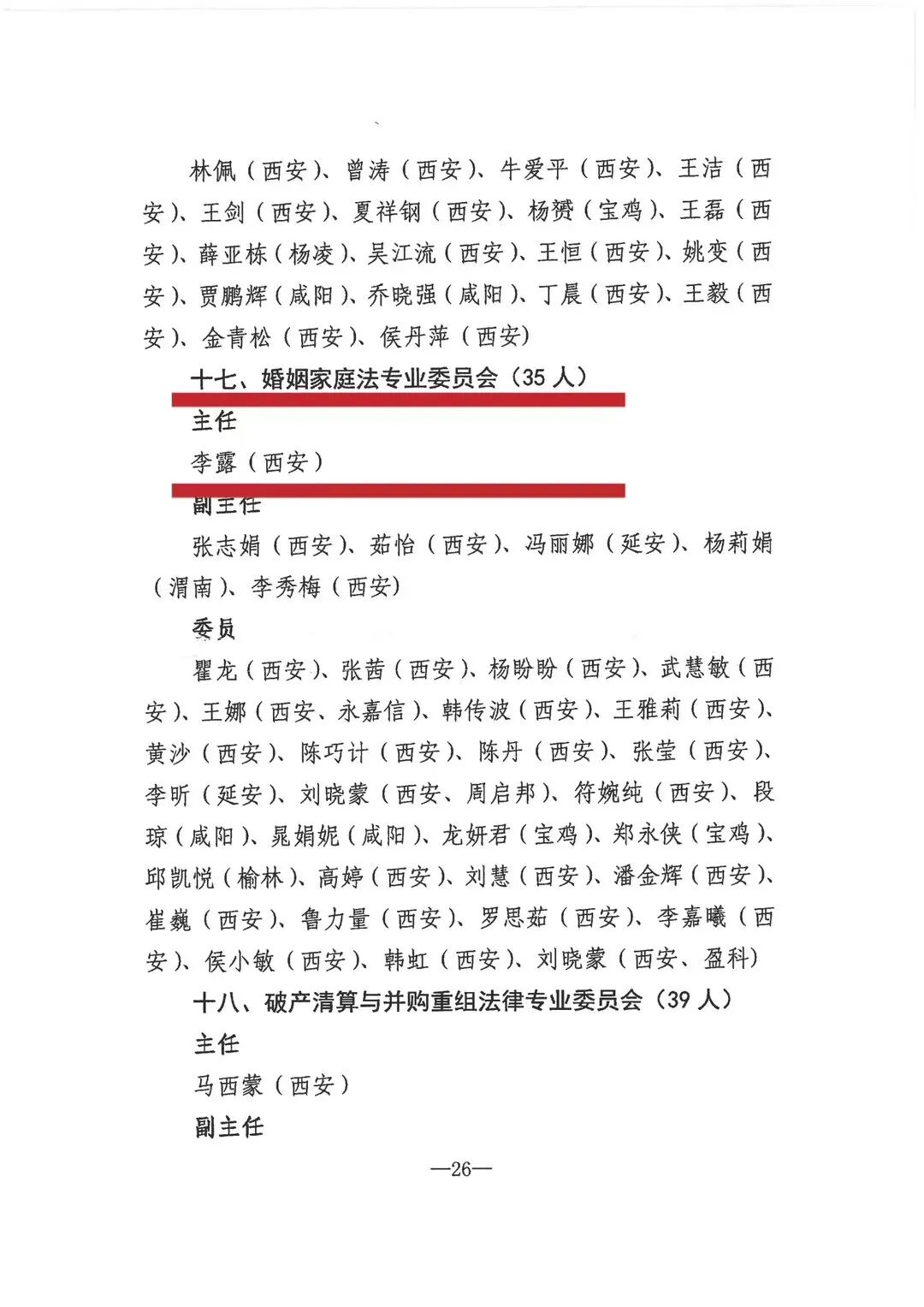 2023年7月31日,陕西省律师协会公布了省律协第八届专门、专业委员会人员名单。我所高级合伙人、婚姻家事与财富传承法律事务部主任李露律师入选婚姻家庭法专业委员会主任。