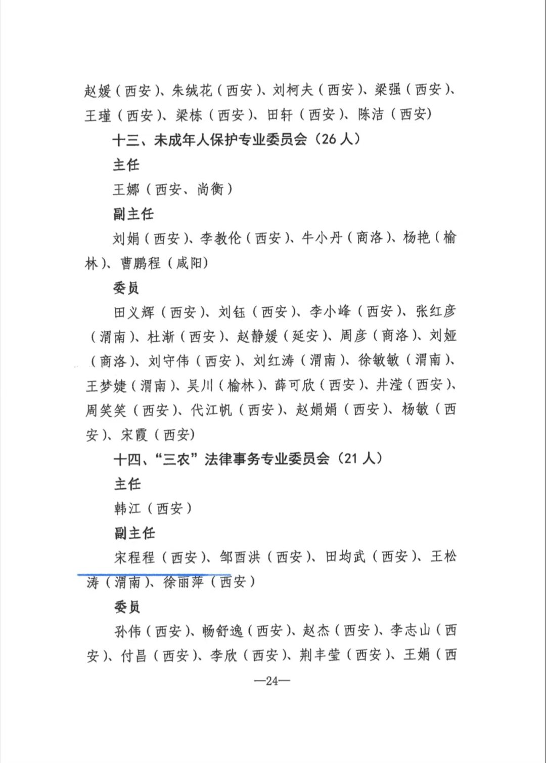 近日,陕西省律师协会公布了省律协第八届专门、专业委员会人员名单。我所高级合伙人、乡村振兴法律实务研究中心主任宋程程律师入选担任“三农”法律事务专业委员会副主任。