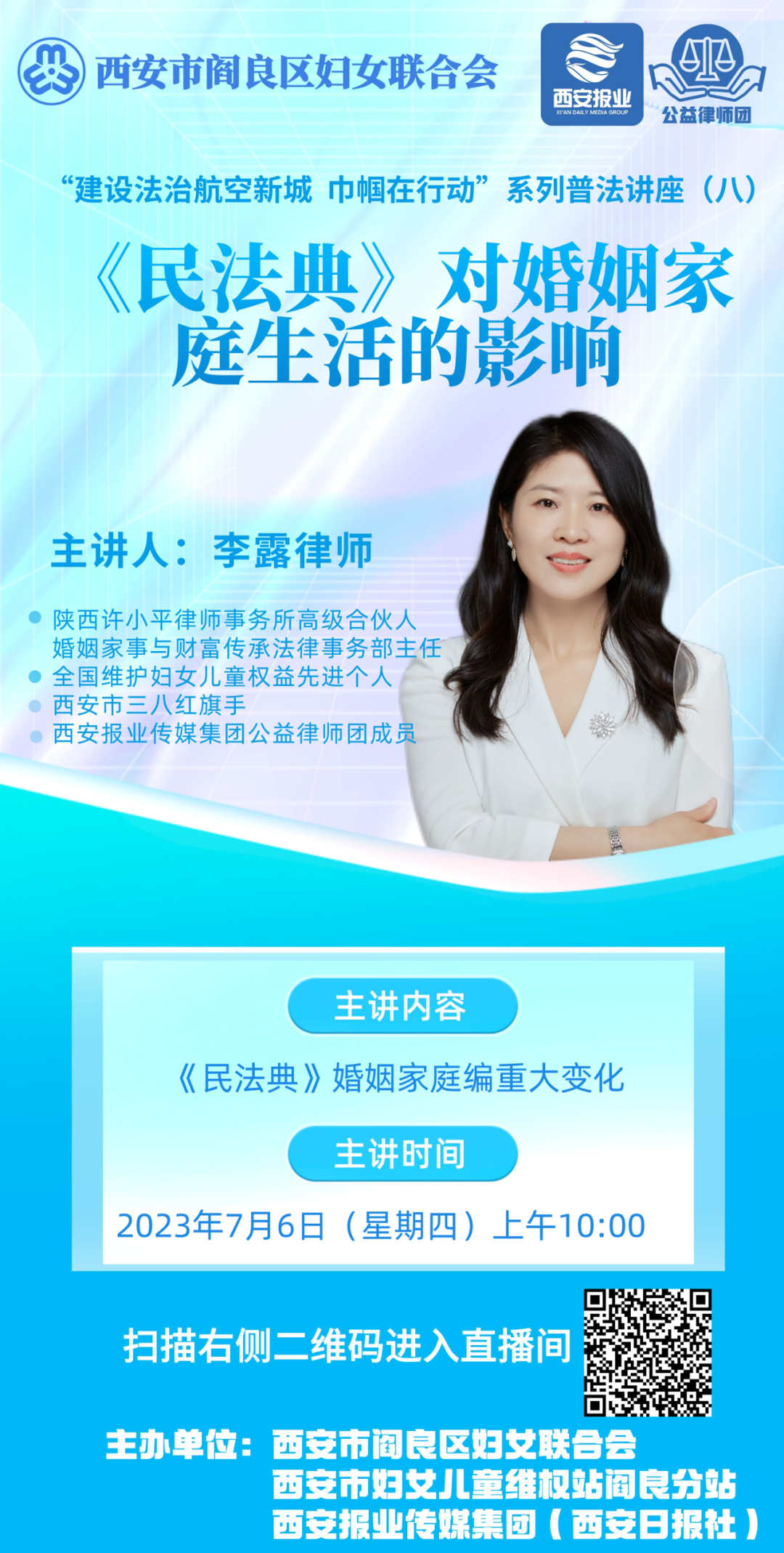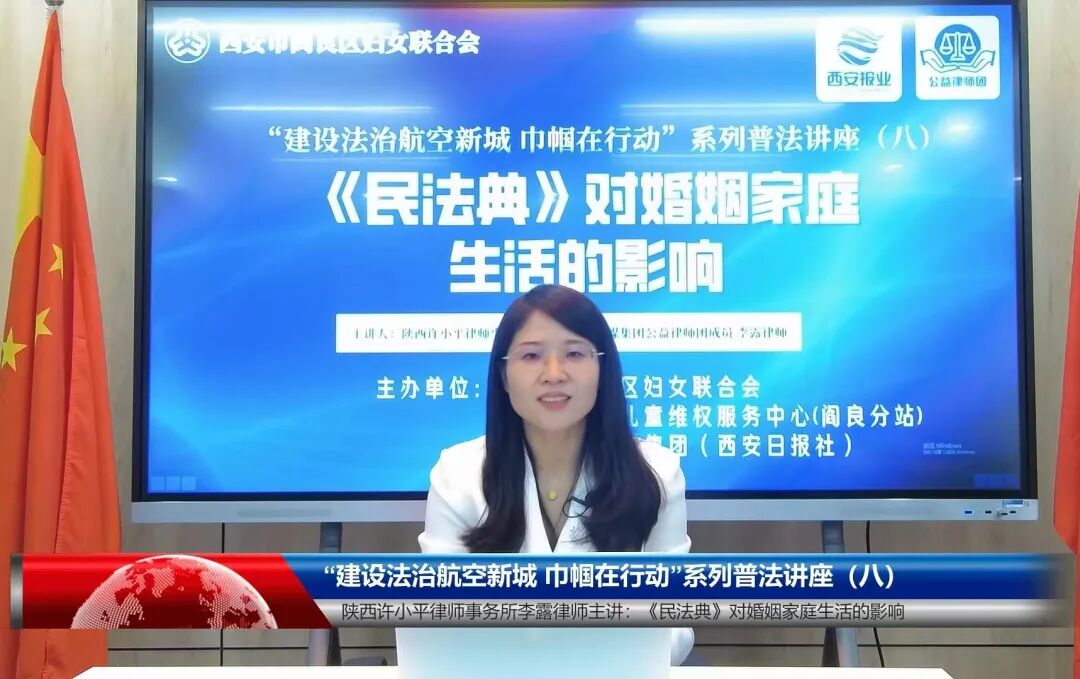 2023年7月6日上午,由西安市阎良区妇联、西安报业传媒集团共同主办的“建设法治航空新城,巾帼在行动”普法宣讲活动成功举行。本次活动特别邀请陕西许小平律师事务所婚姻家事与财富传承法律事务部主任、西安报业传媒集团公益律师团成员李露律师开展“《民法典》对婚姻家庭生活的影响”主题讲座。本次宣讲活动以线上直播的形式进行,阎良区各街道、社区、乡村妇联干部及广大网友聆听了讲座。