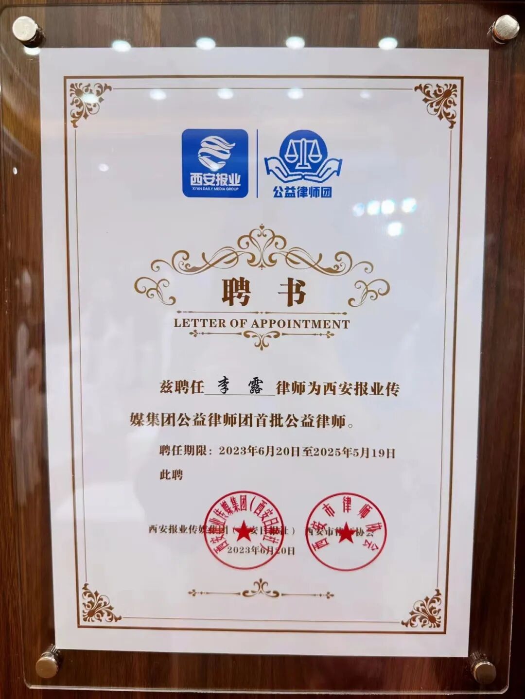作为首批公益律师团成员,李露律师感言道:“在西安日报创刊70周年之际,很荣幸成为西安报业传媒集团公益律师团首批入驻律师,我将秉持“诚信好礼、仗义执言”的所训,竭尽所能投身公益,坚守法律信仰,传递法治力量,为百姓送去最需要、最关心、最贴近生活的法律知识,为家庭幸福、社会和谐、国家发展贡献巾帼力量”。