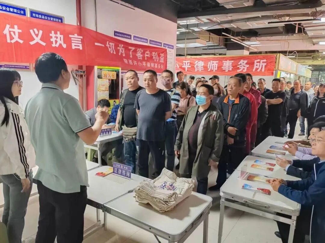 为进一步贯彻落实中央宣传部、司法部、全国普法办日前联合印发《2023年“美好生活·民法典相伴”主题宣传方案》精神。2023年5月26日下午,西安市莲湖区司法局联合陕西许小平律师事务所在莲湖区丰庆路西关街道办开展“民法典”宣讲月活动。此次活动在西关街道丰庆食品商贸中心举办,陕西许小平律师事务所数十名资深律师及丰庆食品商贸中心全体商户参加此次活动。