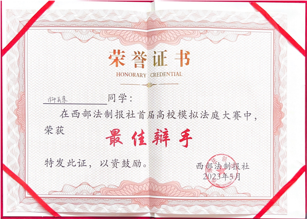 西北大学参赛学子自接到参赛通知以来,我所律师全程认真负责、亲临现场指导,辩手们认真准备,积极备赛,全面展现出西大学子的良好法学素养和厚德重法的风采,将公诚勤朴的优良校训展现的淋漓尽致。经过激烈的初赛的角逐,西北大学代表队不负众望,成功闯入决赛,在决赛中又战胜了西安建筑科技大学代表队和西安财经大学代表队获得冠军荣誉,并且张煖和柳美惠两位学生获得最佳辩手荣誉称号,雄关漫道继续努力,胜利和荣誉属于西北大学。