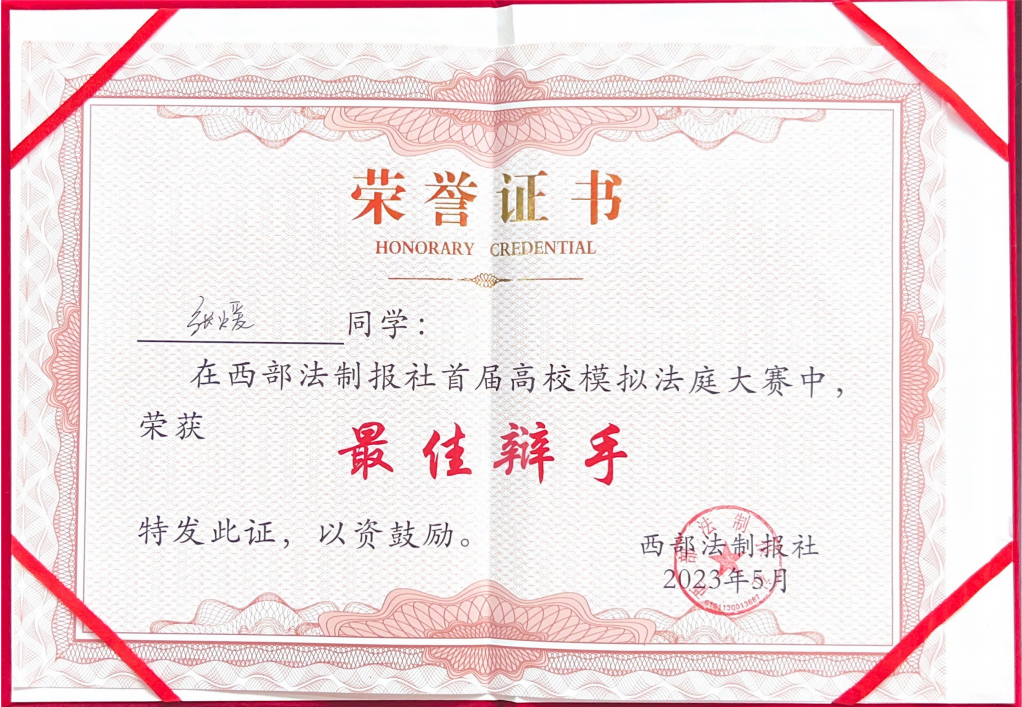 首届模拟法庭辩论赛决赛,主办方特别邀请了渭南市中级人民法院法官、长安区人民检察院检察官以及西北政法大学刑事法学院老师担任评委,赛后法官、检察官以及学校老师分别从各自职业视角对学生们在模拟法庭上的表现进行一一点评。颁奖仪式上,渭南市中级人民法院法官为西北大学代表队颁发一等奖荣誉证书,西北政法大学刑事法学院老师为张煖和柳美惠两位同学颁发最佳辩手荣誉证书。