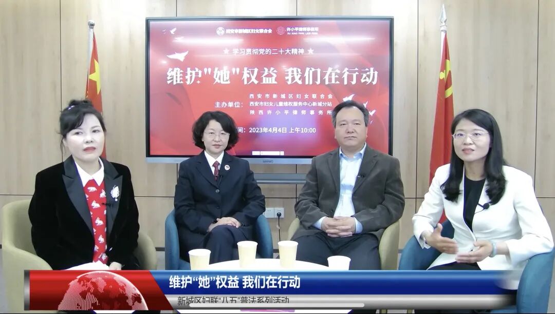 为进一步学习贯彻党的二十大关于促进新时代妇女权益保障的会议精神,大力营造“尊法、学法、守法、用法”的社会氛围,4月4日上午10时,陕西许小平律师事务所与西安市新城区妇女联合会、西安市妇女儿童维权服务中心新城分站共同主办的“维护’她’权益,我们在行动”公益普法直播活动在陕西许小平律师事务所成功举办。本次活动分别邀请到了新城区妇女联合会副主席江华、新城区人民检察院副检察长巨艳、新城区人社局副局长吴全泰以及陕西许小平律师事务所高级合伙人李露,四位嘉宾通过对新修订的《妇女权益保障法》的亮点进行多角度解读,为现场及直播间的观众朋友们献上了一堂详细生动的普法直播课。