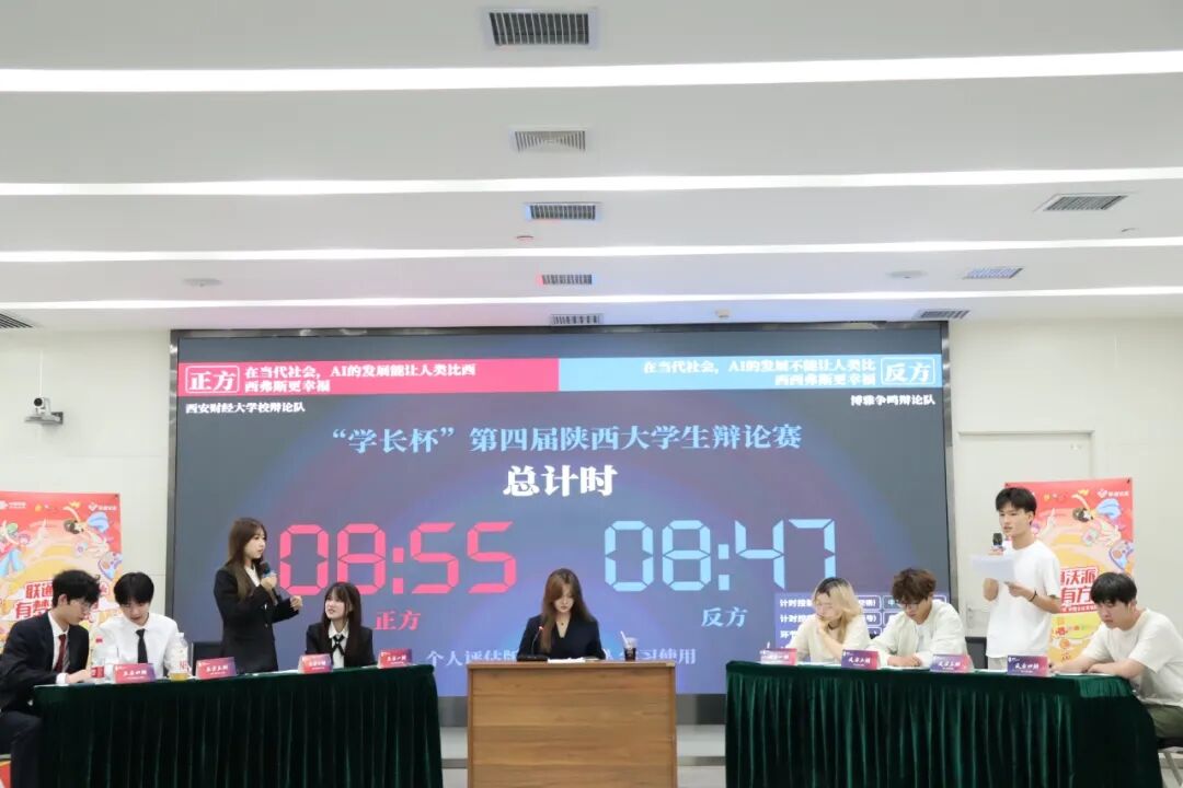 决赛现场,由陕西师范大学、西安建筑科技大学、西安财经大学学子跨校组队的豹豹猫猫辩论队和西安财经大学校辩论队就“在当代社会,AI的发展是否能让人类比西西弗斯更幸福?”这一富有哲学意味的辩题展开激烈辩论。经过激烈的角逐,豹豹猫猫辩论队摘得桂冠,西安财经大学校辩论队获得亚军。