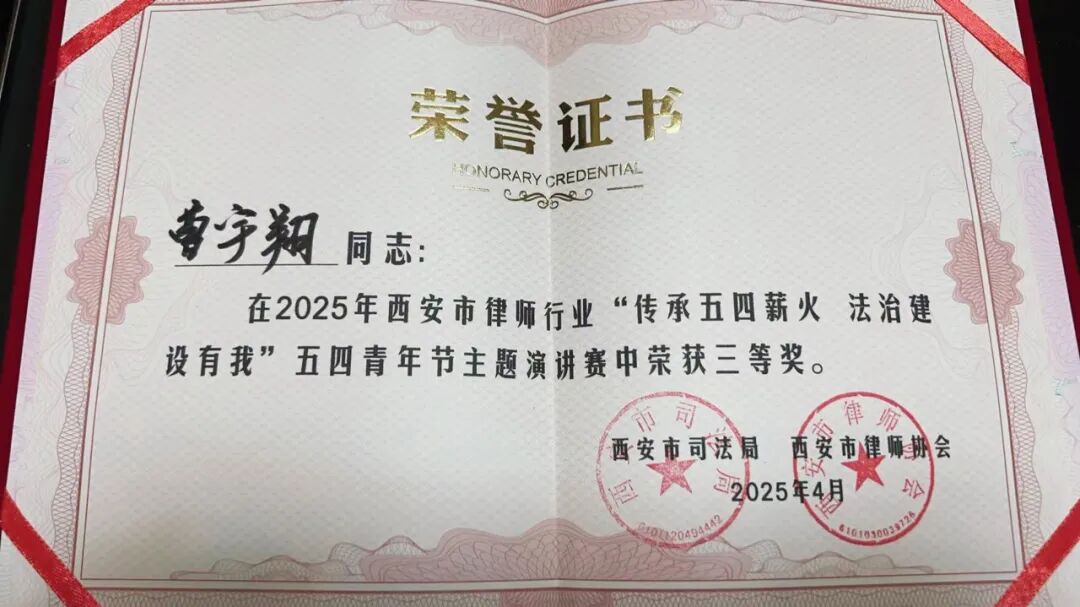我所曹宇翔以饱满的热情和深厚的专业功底展现了令人瞩目的演讲风采。他紧扣“五四”精神与法治建设的内在联系这一主题,声情并茂地进行了精彩阐述。曹宇翔的演讲思路清晰、内容充实,特别突出了青年律师对社会责任与担当的积极践行。他以坚定有力的语调表达了对法治事业的无限热爱和对时代使命的主动担当。通过生动的案例分析和真挚的情感表达,他深入分享了自己在律师服务和社会实践中的宝贵心得。他用简洁而有力的语言,深刻诠释了新时代青年律师应有的责任与担当。凭借出色表现,曹宇翔从众多参赛选手中脱颖而出,最终荣获本次演讲比赛三等奖。